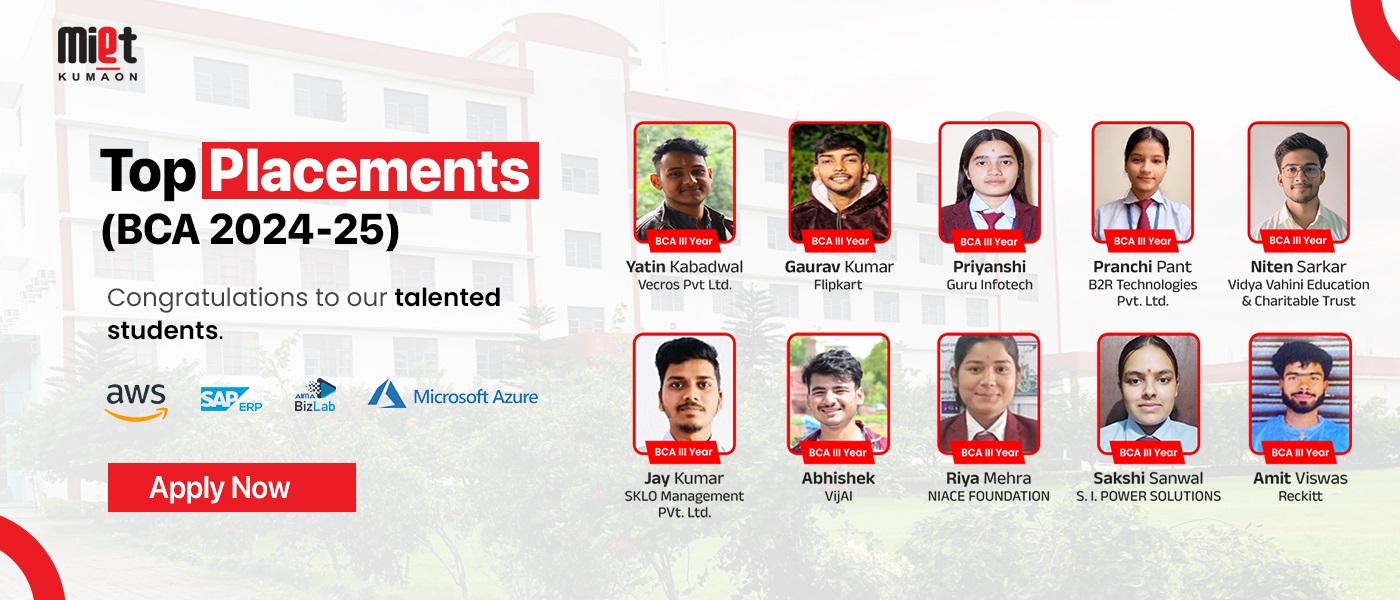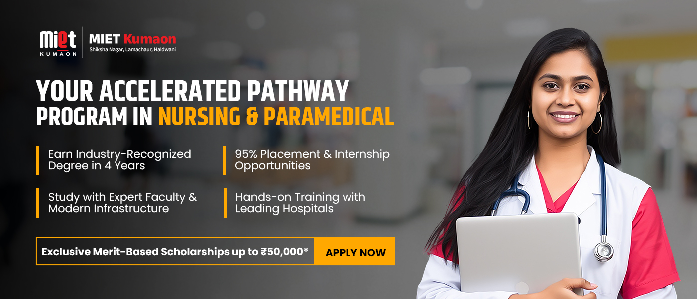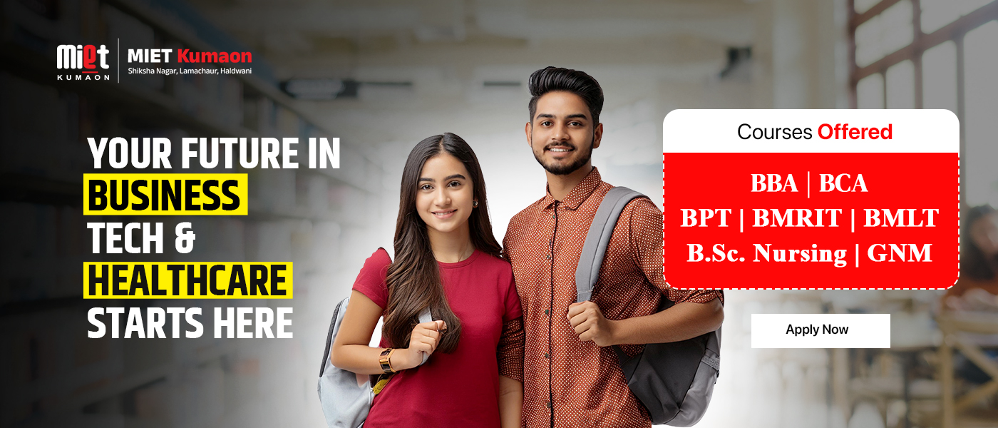 MIET Kumaon offers a range of in-demand courses that prepare students for successful careers. Among the most popular programs are BCA and BBA, ideal for students aspiring to enter the IT and business sectors. In the healthcare domain, BPT, B.Sc Nursing, and GNM stand out for their strong career prospects in hospitals and clinical settings. Technical healthcare courses like BMLT and BRIT are also gaining popularity due to rising demand in diagnostics and imaging. With expert faculty, practical training, and placement support, MIET Kumaon is a top choice for professional education in Uttarakhand.