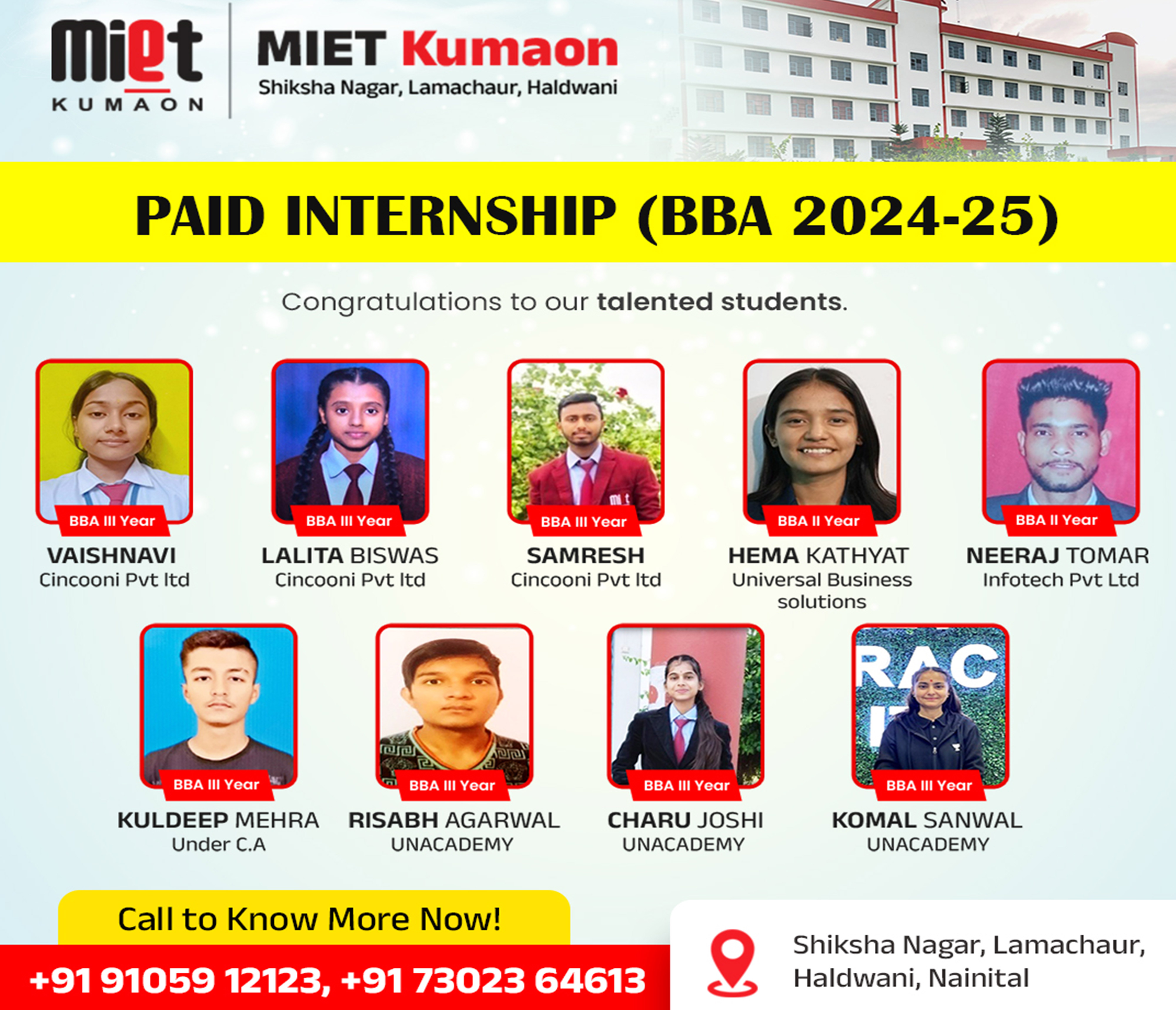 MIET Kumaon, Haldwani is a professional higher education institution established in 2011 under the Devbhumi Foundation, a non-profit educational trust committed to promoting quality education in Uttarakhand. With over 15 years of academic presence, the institution has been consistently contributing to professional education in the fields of technology, management, and healthcare. MIET Kumaon is a part of the reputed MIET Group of Institutions, known for its commitment to academic excellence and career-oriented education.