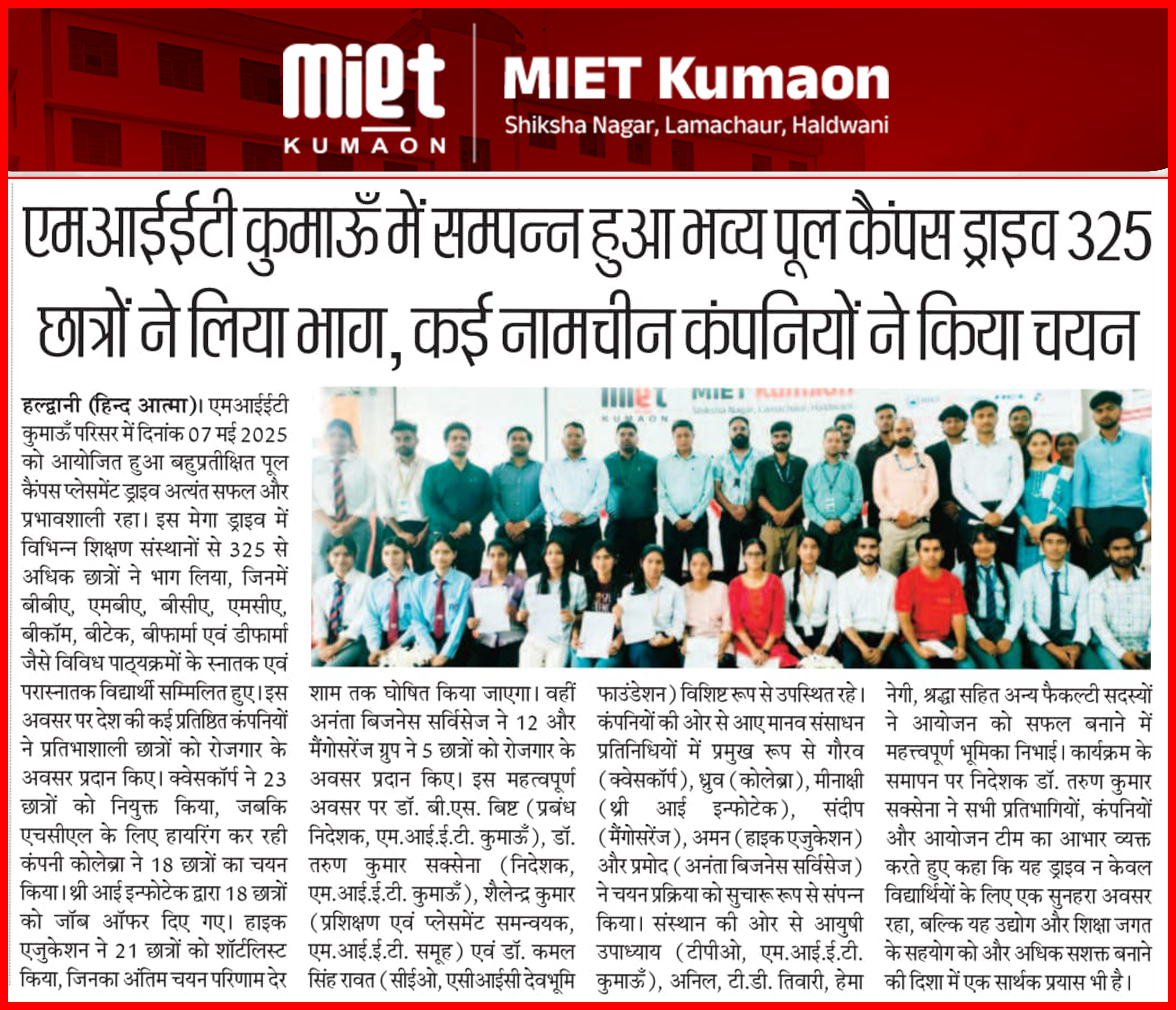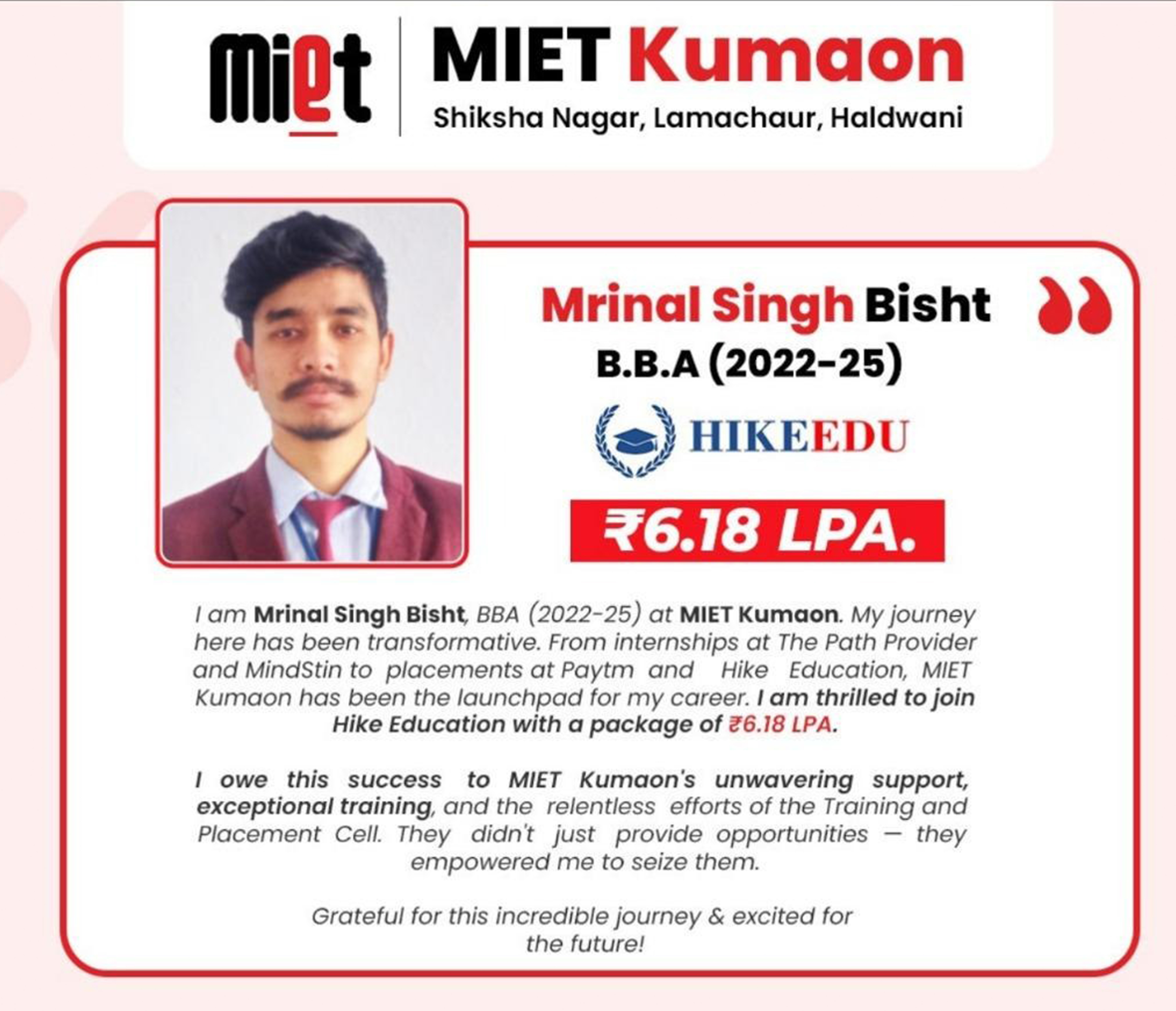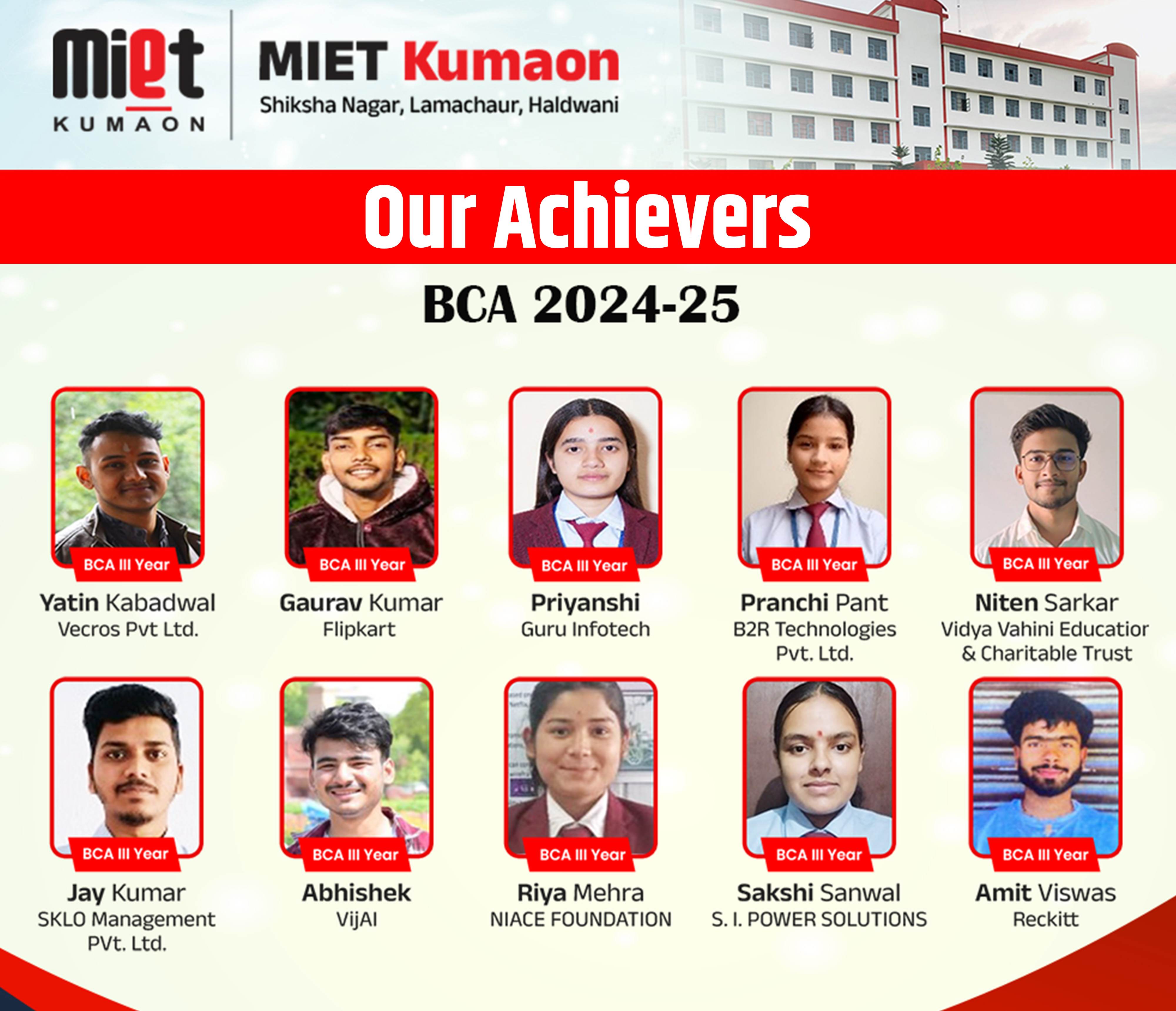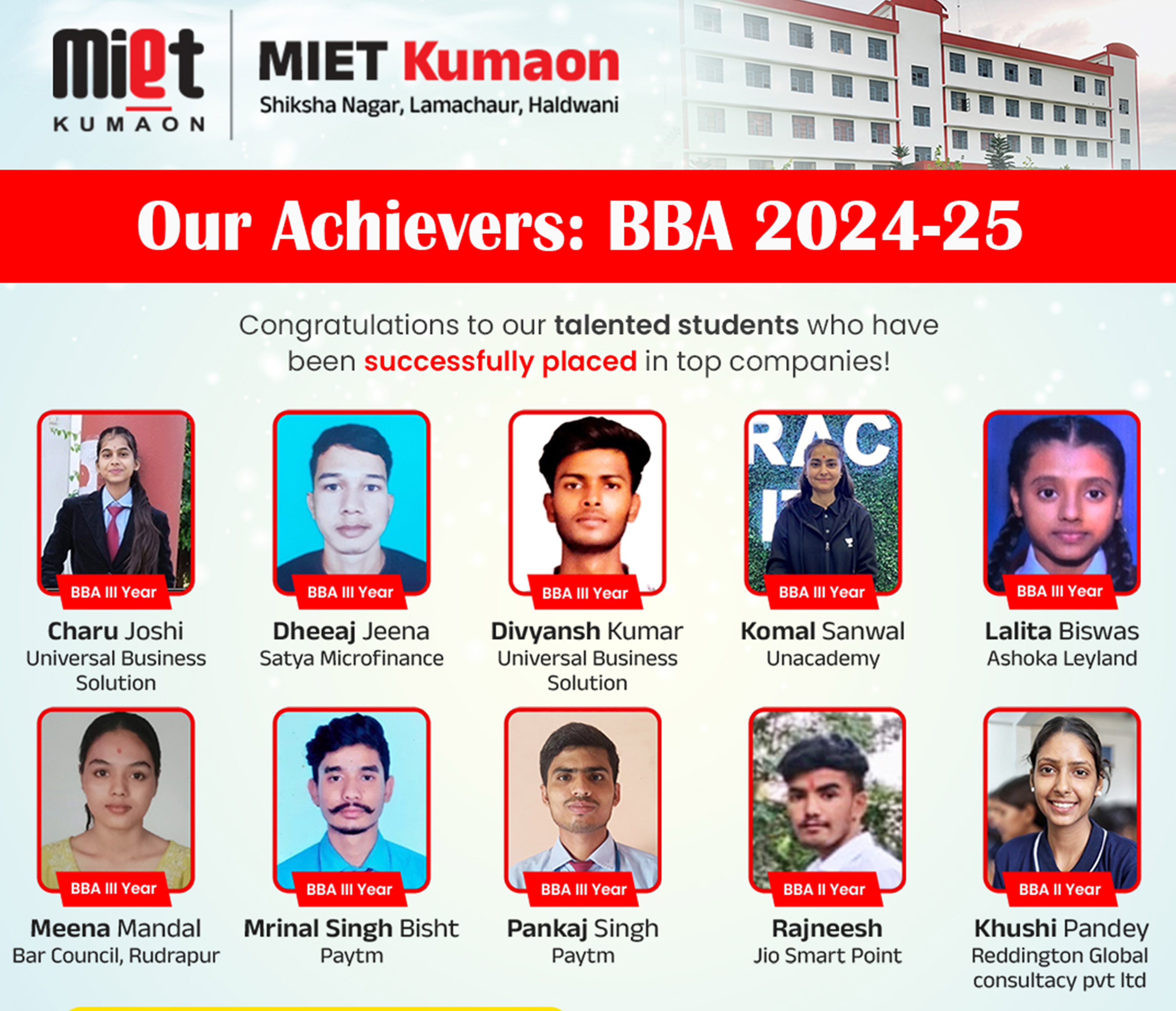 MIET Kumaon, Haldwani is a professional higher education institution established in 2011 under the Devbhumi Foundation, a non-profit educational trust committed to promoting quality education in Uttarakhand. With over 15 years of academic presence, the institution has been consistently contributing to professional education in the fields of technology, management, and healthcare. MIET Kumaon is a part of the reputed MIET Group of Institutions, known for its commitment to academic excellence and career-oriented education.
