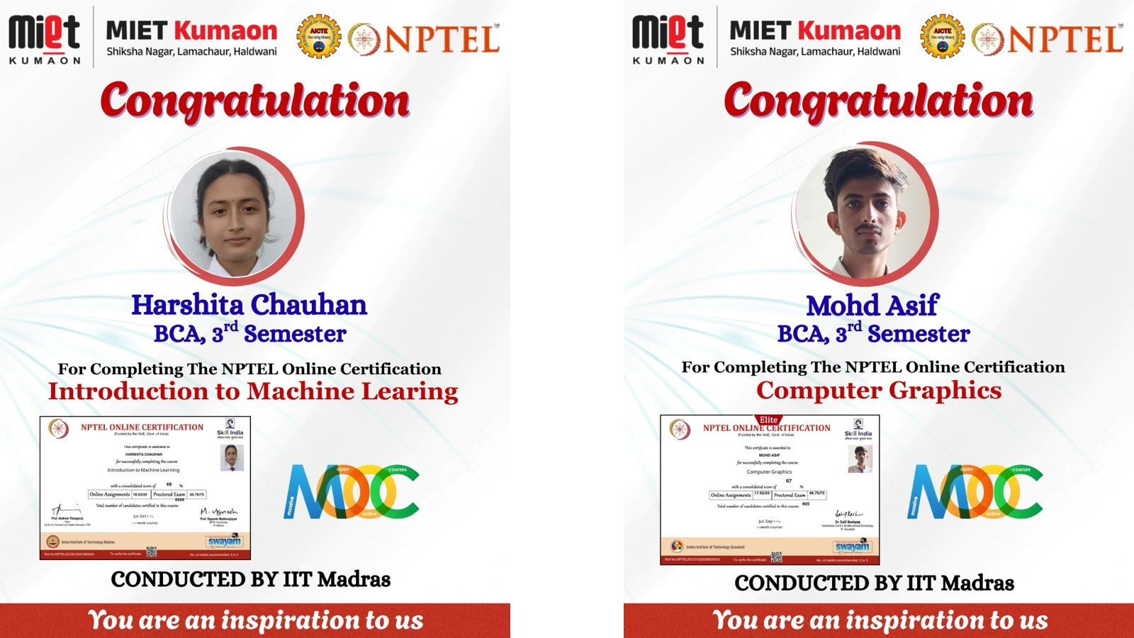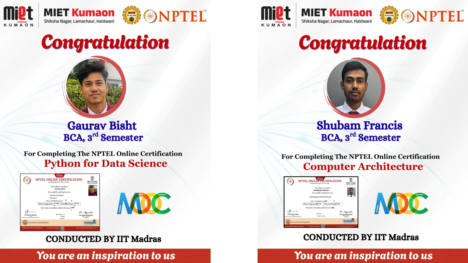 MIET Kumaon takes pride in the achievements of its students and faculty in academics, research, and professional activities. Students actively participate in seminars, workshops, sports, technical and management events, case competitions, coding challenges, and industry-oriented programs, reflecting the institute’s commitment to academic excellence and holistic development. These achievements highlight the focus on building strong technical, analytical, and managerial competencies while preparing students to excel in both business and technology-driven environments.